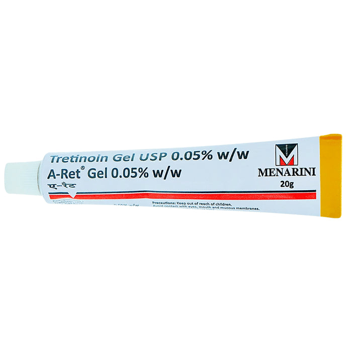 A-Ret 0.05% Gel is a form of vitamin A that is used to treat acne which appears as spots or pimples on your face, chest, or back. It also helps to smooth rough facial skin and to reduce fine wrinkles on the skin. A-Ret 0.05% Gel reduces excessive oil production of the skin. Ideally, a pinpoint application at nighttime is recommended for the duration prescribed by your doctor. The amount you need and for how long you need to take it will depend on what you are being treated for. You should normally wash and dry the affected area before applying a thin layer of this medicine. Follow your doctor’s instructions. You should not apply it to damaged or broken skin and avoid contact with your mouth, eyes, and nose. It may take several weeks for your symptoms to improve but keep using it regularly to get the most benefit. Consult your doctor again if you do not notice any improvement after a few weeks. Using more medicine or applying it more often than prescribed will not make it work any faster and may increase the side effects.The most common side effects include irritation, dryness, and redness of the skin. They are usually mild and improve as your body gets used to the medicine. Drink plenty of water and use moisturizer as it may lead to dryness of the mouth, lips, and eyes. Let your doctor know if these side effects bother you or do not go away. Serious side effects with this medicine are rare.This medicine may make you more sensitive to sunlight so you should limit exposure to the sun if possible. It may make your skin more fragile. It is advised, not to have any waxing (hair removal), or laser treatments during treatment. Pregnant women or women who are planning to get pregnant should not use this medicine as it can lead to birth defects.
