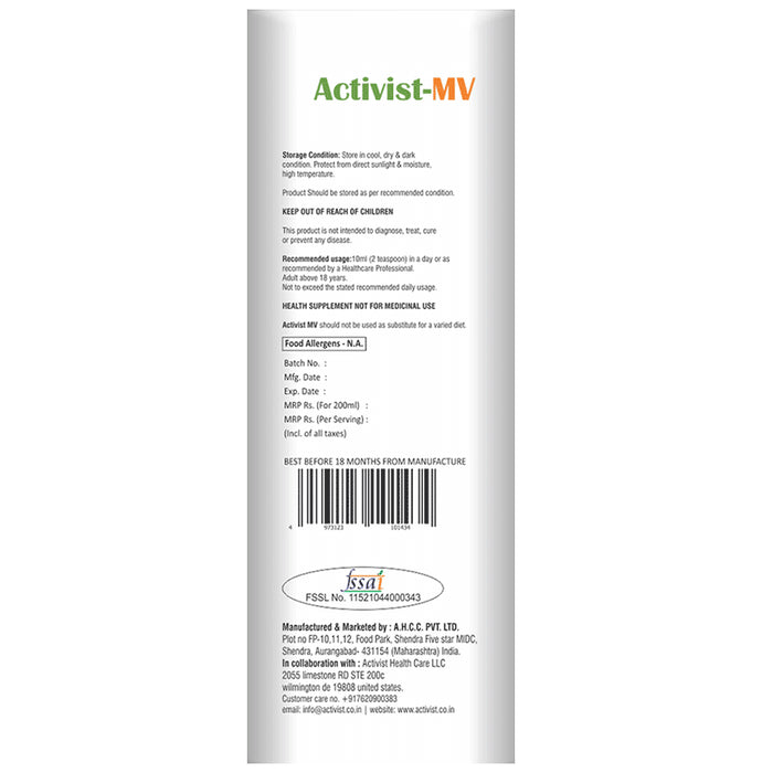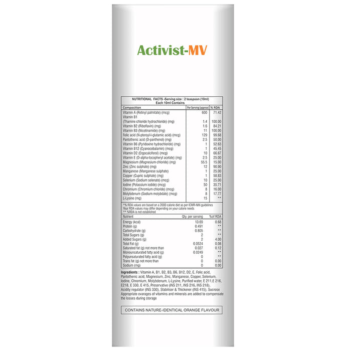 Activist-MV Syrup is a powerful formulation containing multivitamins, multi-minerals, antioxidants, and amino acids. This formula is effective for the wellness of the skin and hair. It helps break down food and improves the functions of the brain.