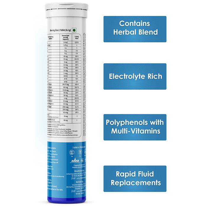 Azani Active Nutrition Rehydration Effervescent Tablets instantly fuels the body and powers the best self. One effervescent tablet can equal up to ten conventional tablets in active dose amounts. Its rich electrolytes fight fatigue, power the person instantly, balance the amount of water in the body and increase endurance. The natural herbal blend has powerful micro-nutrients like ashwagandha and brahmi to fight stress and anxiety and ginger and tulsi to reduce inflammation and strengthen immunity, all of which improve the fitness and performance. This is best consumed first thing in the morning, 30 mins before the workout, after the workout, after sun exposure, as a mid-day revitaliser, during hangovers and before and after long flights.