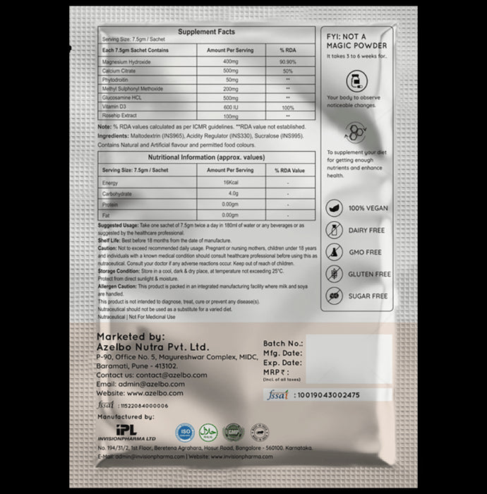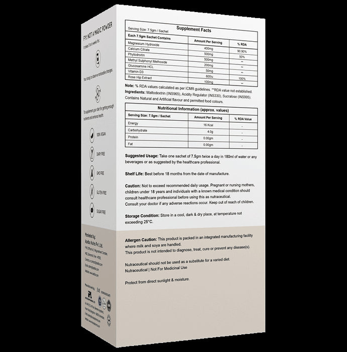 Composition : Each sachet of 7.5 gm contains:Magnesium Hydroxide – 400 mg,Calcium Citrate – 500 mg,Phytodroitin – 50 mg,Methyl Sulphonyl Methoxide (MSM) – 200 mg,Glucosamine HCL – 500 mg,Vitamin D3 – 600 IU,Rose Hip Extract- 100 mg