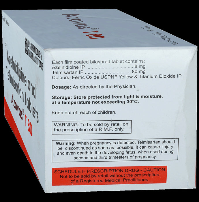 Azovas T 80 Tablet is a combination medicine used in the treatment of hypertension (high blood pressure). It widens and relaxes the blood vessels, thereby lowering your blood pressure and reducing the workload of your heart. Controlling your blood pressure prevents future complications. Azovas T 80 Tablet may be taken with or without food. Take it regularly and at a fixed time each day to get maximum benefits from it. In case you have missed any doses, take it as soon as you remember it. Never skip any doses and finish a full course of treatment even if you feel better. Do not stop taking suddenly without talking to the doctor as it may worsen your symptoms.The most common side effects of this medicine include dizziness, headache, nausea, and numbness. These are usually mild but let your doctor know if they bother you or last more than a few days. You may be asked for regular monitoring of blood pressure, kidney function, and blood glucose level while taking this medicine.Before taking this medicine, tell your doctor if you have liver or kidney disease. You must tell your doctor if you are pregnant, planning pregnancy, or breastfeeding. You should also let your healthcare team know all other medicines you are taking as they may affect, or be affected by this medicine.