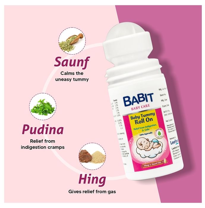 Babit Baby Tummy Roll On Oil has natural ingredients like hing and saunf, which are safe for a baby’s soft skin. It helps in relief from colic, indigestion, and stomach ache. Hing and saunf have anti-inflammatory and anti-flatulent properties as it relieves all stomach-related problems. It also provides a soothing effect on the baby's skin. Babit tummy roll is easy to use and carry. This ayurvedic formulation is effective and gives instant relief from tummy aches and indigestion in your baby. All ingredients used are natural and free of toxins. They are safe to be used on the sensitive skin of babies.