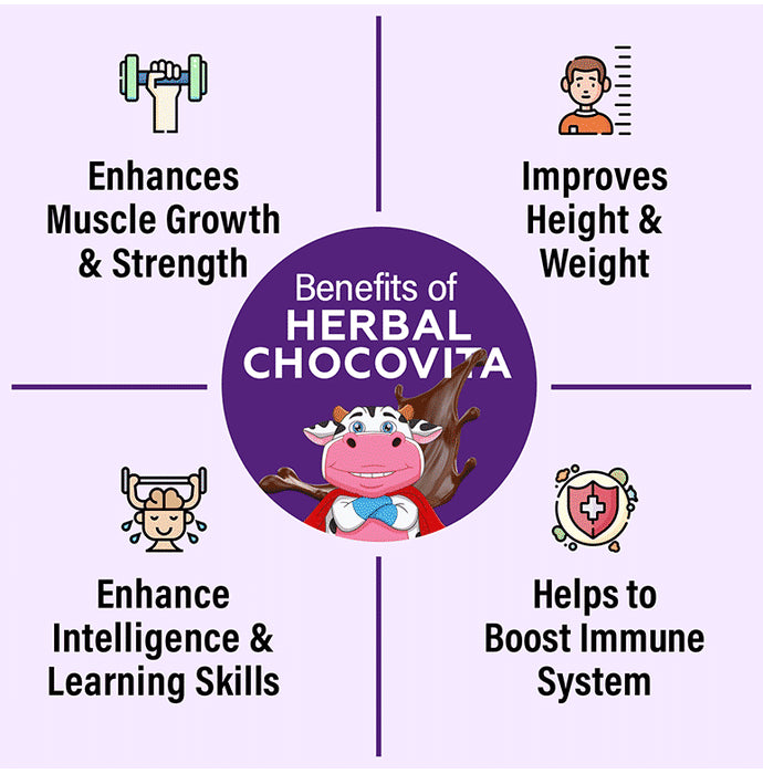 Baby Organo Herval Chocovita Kids Granules are micronutrient health supplement granules enriched with 15+ ayurvedic herbs. It is essential for children’s growth and helps in increasing their stamina.Key Ingredients