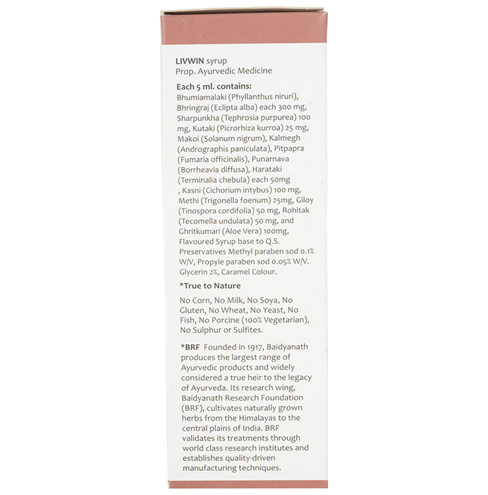 Baidyanath Ayurvedant Livwin Syrup can promote healthy digestion in our bodies. It may improve appetite, digestion and assimilation of nutrients. It can help to manage liver concerns like fatty liver, cirrhosis and alcoholic liver concerns. It may help manage hepatitis B and C with Bhumiamla or Kutaki. Moreover, it can manage dyspepsia and jaundice by regulating bile production and expulsion without causing dryness in the throat.Ingredients:Bhumiamalaki (300 mg)Bhringraj (300 mg)Sharpunkha (100 mg)Kutaki (25 mg)Makoi (50 mg)Kalmegh (50 mg)Pitpapra (50 mg)Punarnava (50 mg)Haritaki (50 mg)Kasni (100 mg)Methi (25 mg)Giloy (50 mg)Rohitak (50 mg)Ghritkumari (100 mg)Key Benefits:It can act as liver tonicIt may help in viral hepatitisIt may help in jaundice and fatty liver changesThe syrup may increase appetiteIt is vegetarian and does not contain corn, milk, soya, gluten, wheat, yeast, fish, sulphur or sulphur or sulfitesDirections For Use:As directed on the labelSafety Information: Read the label carefully before useStore in a cool and dry place, away from sunlightKeep out of reach of childrenUse under medical supervision