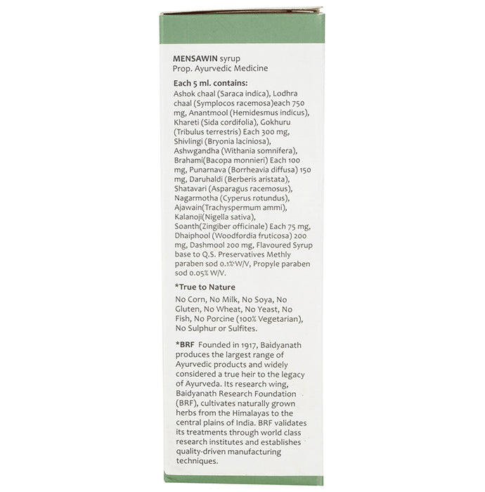Composition : Ashok chaal (saraca indica),Lodhra chaal (symplocos racemosa),Anantmool (hemidesmus indicus),Bala (sida cordifolia),Gokhuru (tribulus terrestris),Shivlingi( bryonia laciniosa),Ashwgandha (withania somnifera),Brahmi (bacopa monnieri),Punarnava (borrheavia diffusa) 150 mg,Daruhaldi (berberis aristata),Shatavari (aspargous racemosus),Nagarmotha (cyperus rotundus),Ajawain (trachyspermum ammi),Kalanoji (nigella sativa),Soanth (zingiber officinale),Dhaiphool (woodfordia fruticosa) 200 mg