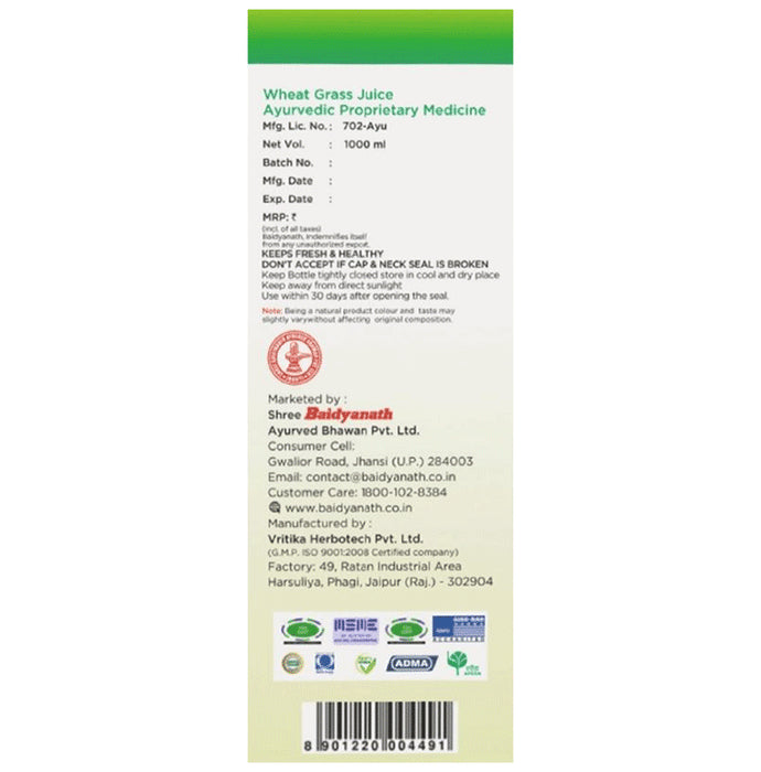 Baidyanath Jhansi Wheat Grass Juice is prepared from the fresh leaves of wheat grass fortified with the juice of tulsi and giloy. It is rich in nutrients and antioxidants. Tulsi is considered a powerful antioxidant and immunity booster. Giloy helps protect against various bacterial and viral infections.