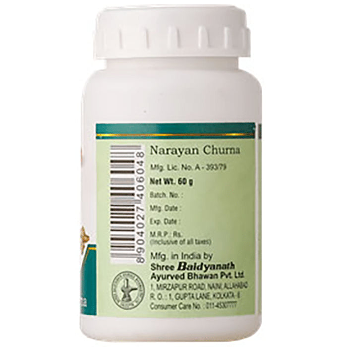 Baidyanath (Noida) Narayan Churna is an Ayurvedic remedy in the form of a herbal powder. It is utilised in the Ayurvedic treatment of gastrointestinal problems such as bloating and constipation, as well as respiratory problems. It contains Triphala, a natural laxative that relieves constipation, abdominal pain, and flatulence. It has been used to relieve gastrointestinal ailments.