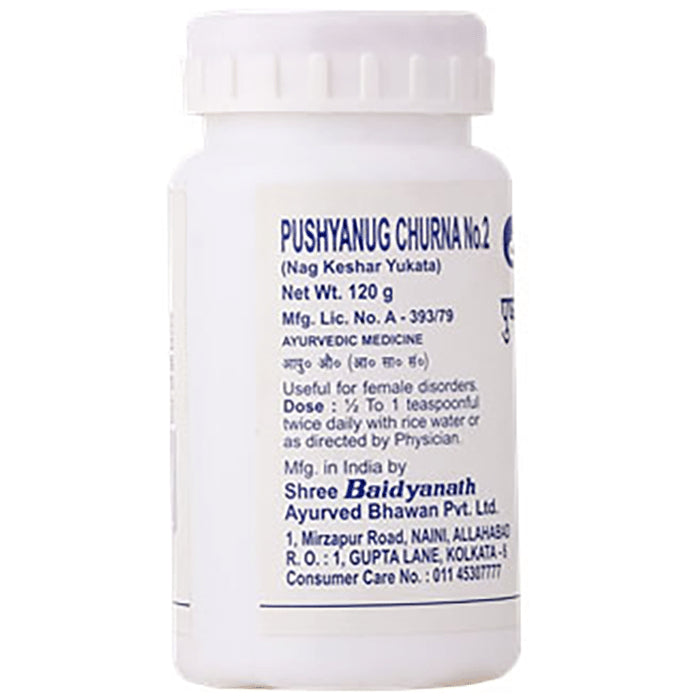 Baidyanath (Noida) Pushyanug Churna No.2 (Nag Keshar Yukata) aids in the treatment of menstrual irregularities and menorrhagia. It contains Arjun chhal, which balances Pitta dosha and helps to regulate excessive bleeding during menstruation. It also contains Nagarmustaka, which helps with premenstrual syndrome and stress and anxiety relief.