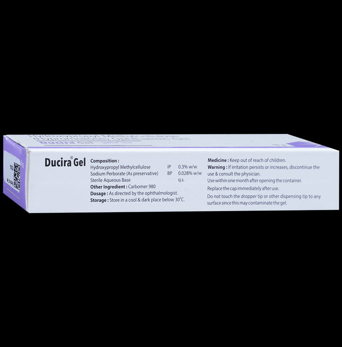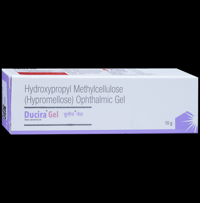Ducira Gel is a combination of medicines that is used to treat dry eyes. It relieves the symptoms of dry eyes such as pain, discomfort and irritation. It also provides lubrication to the eyes and helps in maintaining the moisture of the eyes.Ducira Gel is to be used only in the affected eye in the dose and duration as advised by the doctor. Wash your hands before using this medicine. It is advised to check the label for directions before use. Do not skip any doses and finish the full course of treatment even if you feel better. Stopping the medicine too early may lead to the infection returning or worsening.The most common side effects include blurring of vision at the application site. If this side effect persists for a longer duration, inform your doctor. In case by accident, this medicine goes into your ears, nose or mouth, immediately rinse it with water.Inform your doctor if you are pregnant or breastfeeding or are allergic to this medicine or taking any other medication. It is advised not to drive or operate heavy machinery after use of this medicine as it may cause blurring of vision and may affect your ability to drive.