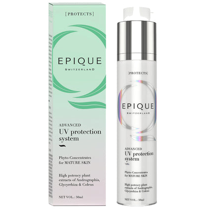 Epique Advance UV Protection System is an ultra-lightweight long-lasting broad-spectrum 50 SPF (UVA+UVB) protection cream. It is infused with multi-action ‘Phyto-concentrates’ (high potency plant extracts) of andrographis paniculata leaf, piper nigrum fruit, boswellia serrata resin, glycyrrhiza glabra root and coleus forskohlii root. These ‘Phyto-concentrates’ have been specially developed for mature skin care.