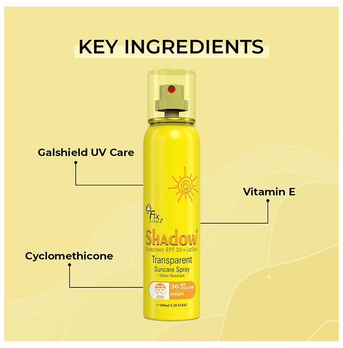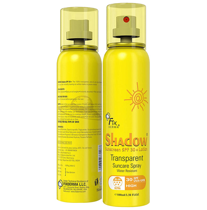 Fixderma Shadow Sunscreen Lotion SPF 30+ aids in the prevention of UV damage to the skin, such as wrinkles, fine lines, and sunspots. It protects skin from UVA and UVB radiation, which helps to alleviate redness, irritation, and skin inflammation. It contains Cyclomethicone, which improves the skin's texture and sensory feel while also reducing irritation and the appearance of dryness. It also contains vitamin E, which functions as an antioxidant and acts as a natural moisture barrier on our skin.