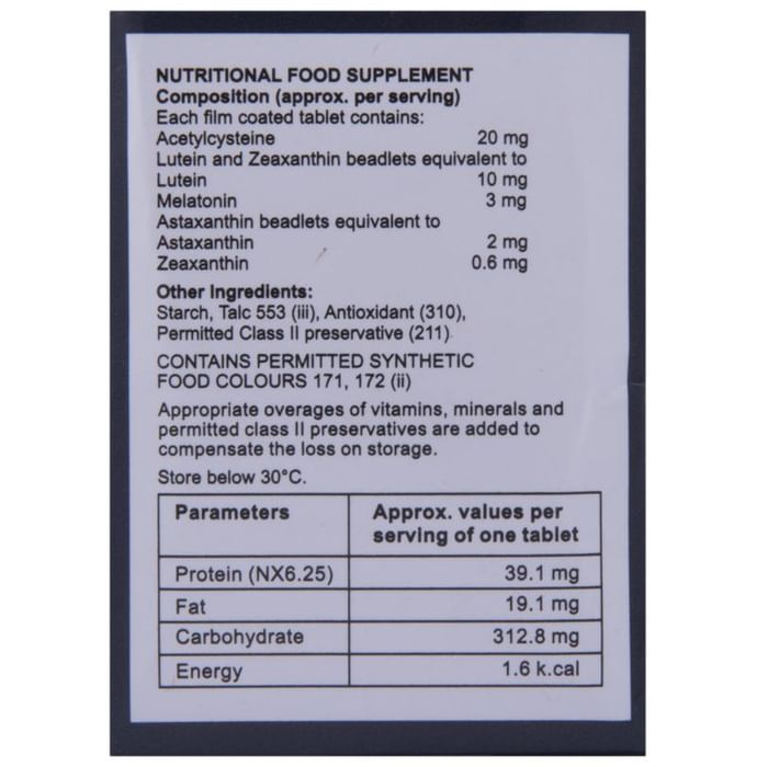 Composition : Astaxanthin,Lutein,Melatonin,N-Acetylcysteine,Zeaxanthin