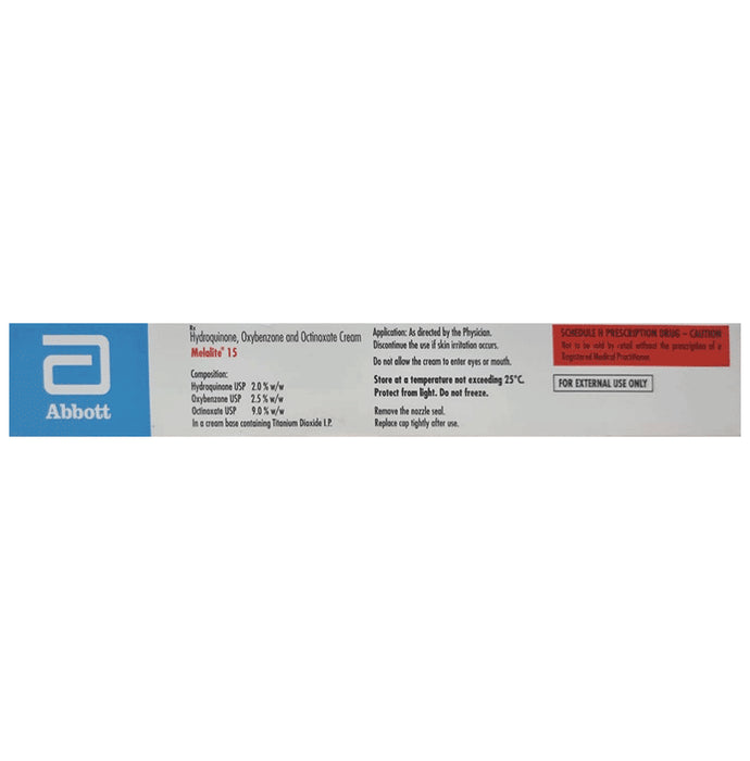Melalite 15 Cream is a combination medicine that is used in the treatment of hyperpigmentation of the skin. It helps in brightening up the skin and provides protection to the skin from sun rays.Melalite 15 Cream should be used in the dose and duration as advised by your doctor. It is for external use only. Wash your hands before using this medicine. Apply only on the affected areas of the skin. It is advised to check the label for directions before use. The most common side effects include skin irritation and burning sensation at the application site.If this side effect persist for a longer duration, inform your doctor. In case by accident, this medicine goes into your eyes, ears, nose or mouth, immediately rinse it with water. Inform your doctor if you notice darkening or discoloration, or severe burning sensation at the treated skin.Inform your doctor if you have known allergies from this medicine. If you are pregnant or suffering from any other condition, please inform your doctor. This medicine is safe to use in breastfeeding mothers.