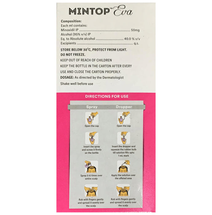 Mintop Eva Solution is a potassium channel opener. Its vasodilation action expands the blood vessels. Therefore, when it is applied to the scalp, it helps to increase blood flow. This increased blood flow provides more nutrition and oxygen to the hair follicles, which prevents hair cell death and also enhances new hair growth. This is how it works to treat your alopecia (hair loss).