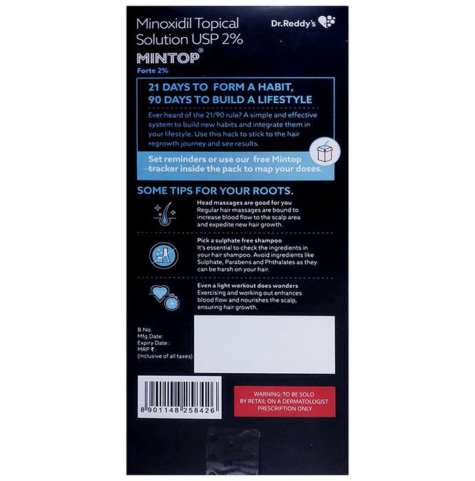 Mintop Forte 2 % Hair Regrowth Formula is a potassium channel opener. Its vasodilation action expands the blood vessels. Therefore, when it is applied to the scalp, it helps to increase blood flow. This increased blood flow provides more nutrition and oxygen to the hair follicles, which prevents hair cell death and also enhances new hair growth. This is how it works to treat your alopecia (hair loss).