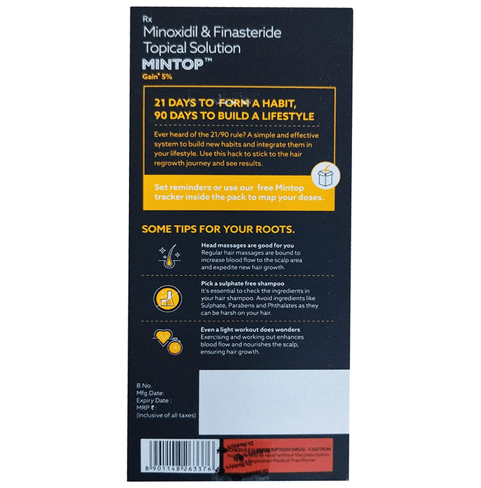 Mintop Gain 5 + Hair Regrowth Formula Kit is a combination medicine used in the treatment of hair loss in men. It works by increasing blood flow to the hair follicles which further prevents hair loss and stimulates re-growth resulting in longer, thicker and increased numbers of hair. Use Mintop Gain 5 + Hair Regrowth Formula Kit in the dose and duration as prescribed by your doctor or as instructed in the label. Clean and dry your scalp before using it. It may take several months before you notice any hair growth. The first growth could be soft, colorless, and barely visible. Use it in the exact dose and duration as prescribed by your doctor. Using more than recommended will not speed up hair growth and may increase the likelihood of side effects. Use it for as long as the doctor has prescribed to maintain proper hair growth. If your condition does not improve after using it for 4 to 6 months, tell your doctor. This medicine is to be used only by men and not indicated in women.Common side effects of this medicine include application site reactions, dry skin, impotence, decreased libido, ejaculation disorders, breast enlargement, breast tenderness in males, and skin rash. In case of accidental contact with other parts of the body, it may cause excessive hair growth. If you get it in your eyes, mouth, or broken skin, rinse thoroughly with plenty of water. Talk to your doctor if you are bothered by side effects or they do not go away.To ensure its safety, before using this medicine, let your doctor know if you have any problems with your heart. Additionally, inform your doctor about all the medicines you are taking. Pregnant, potentially pregnant, or breastfeeding women should not handle this medicine because of the possibility of absorption of finasteride. As it may cause potential harm to a male baby or fetus.