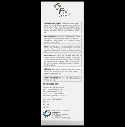 Nigrifix Cream is effective for eliminating black spots on the neck, ankles, and armpits, among other body areas. It contains retinol, which promotes the creation of new blood vessels and decreases fine lines and wrinkles by increasing collagen production. Lactic acid is also present, which aids in cell turnover and the elimination of dead skin cells from the epidermis.