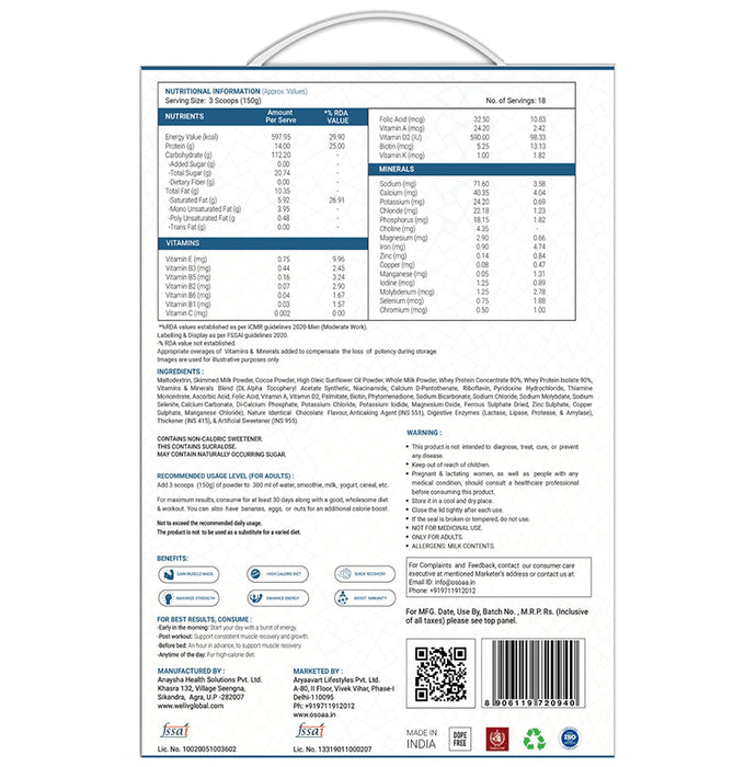 OSOAA Xtreme Gainer is engineered to deliver high carbs diet for those individuals who dream high & want to go above and beyond in their relentless chase of bigger muscles. It is prepared with premium quality protein & carbs sources along with some essential vitamins and minerals for immunity and good metabolism. It is 100% unadulterated and each batch is tested for quality. OSOAA Xtreme Gainer comes in a very delicious swiss chocolate flavour. With an ample 14 g protein and 112.20g carbohydrate, this Xtreme Gainer optimizes glycogen levels and provides energy for workouts. Hence, giving you incredible returns on your daily workout efforts in the form of great muscle recovery, enhanced energy and superior muscle building.