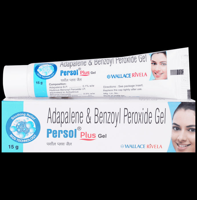 Persol Plus Gel is a combination of two medicines: Adapalene and Benzoyl Peroxide, which treats acne (pimples). Adapalene is a form of vitamin A and Benzoyl Peroxide is a keratolytic medicine. Together, they prevent accumulation of the sebum (skin’s natural oil), unblock the pores and allow natural exfoliation of the outer layers of skin. Benzoyl Peroxide additionally penetrates into the skin and kills acne-causing bacteria.