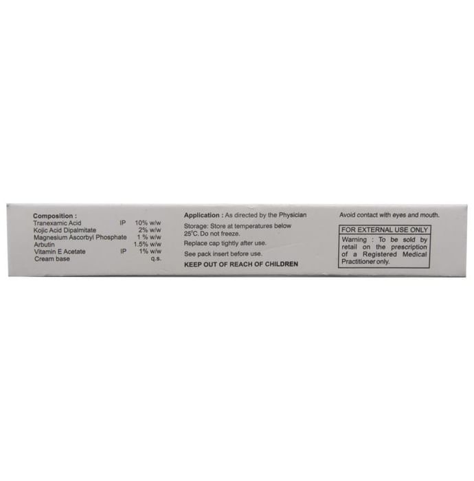 Composition : Tranexamic Acid (10% w/w) + Kojic Acid (2% w/w) + Arbutin (1.5% w/w) + Magnesium (1% w/w) + Vitamin E (1% w/w) + Mulberry extract (1% w/w)
